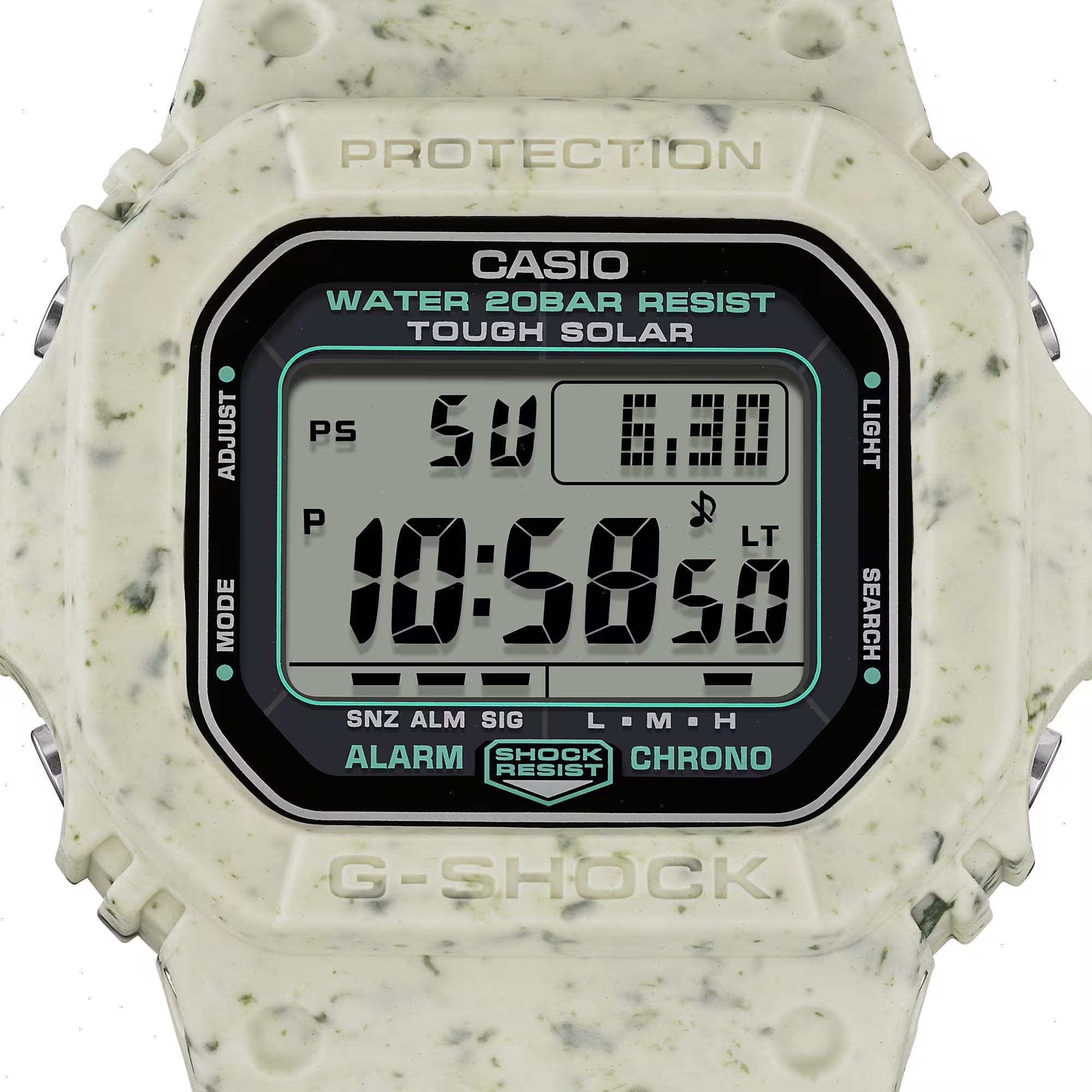 The G5600BG-5 makes the most of resin left over from the manufacture of components for other watches. Waste resin in white and olive green is powdered and kneaded into a beige base, creating a special design with a unique, subtly colorful pattern that will take you wherever you want to go — from everyday fun to fashionable occasions.